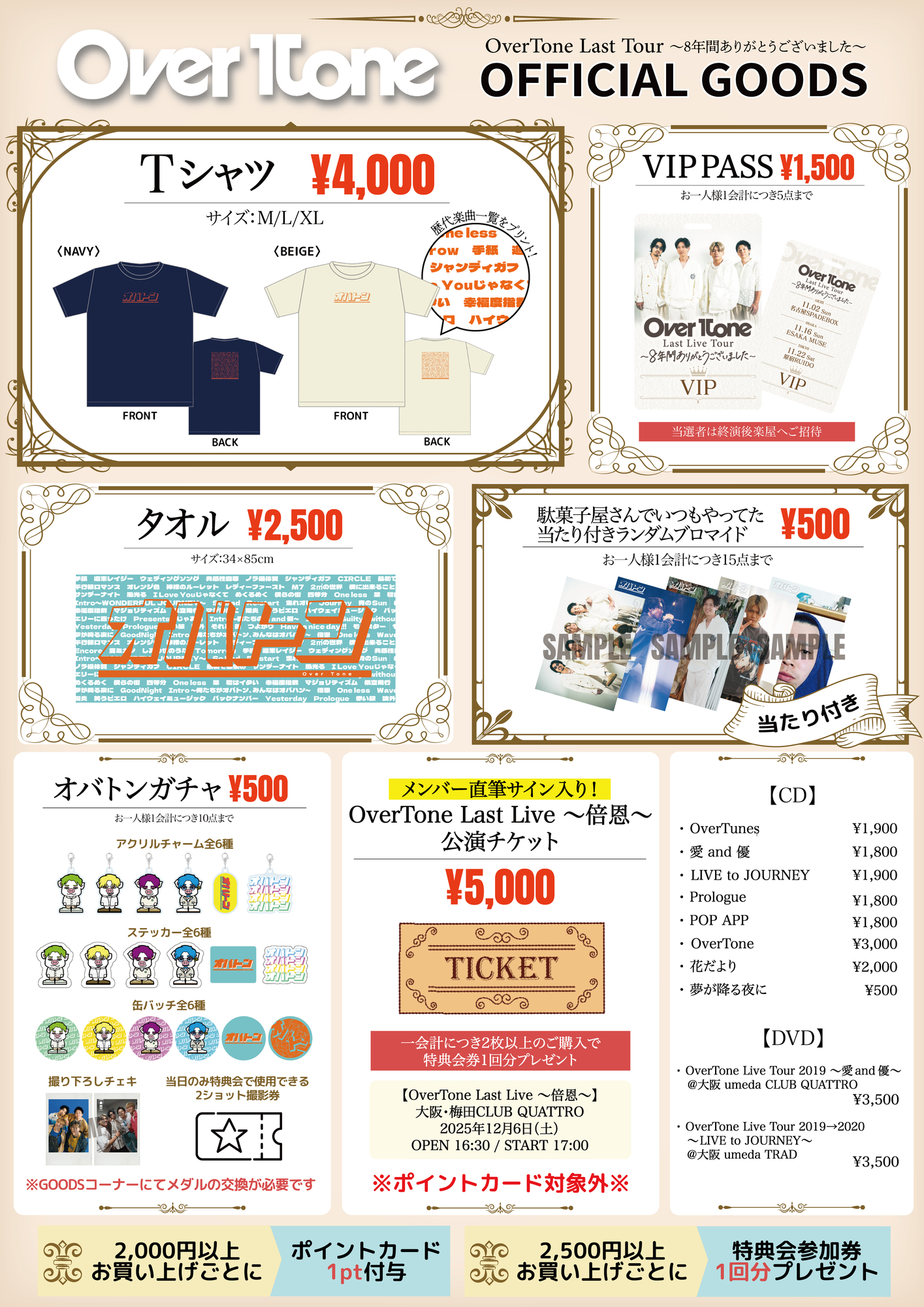 ※ OverToneオフィシャルグッズを2,500円ご購入ごとに、特典会参加券を1枚お渡しいたします。